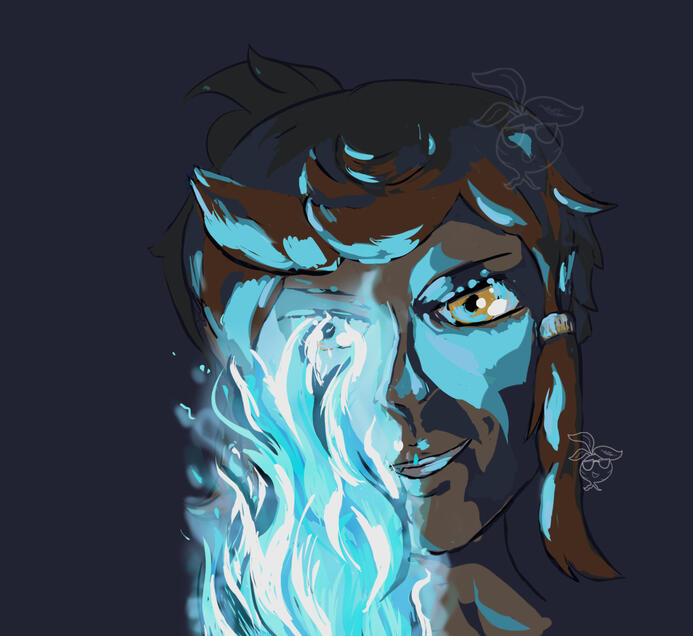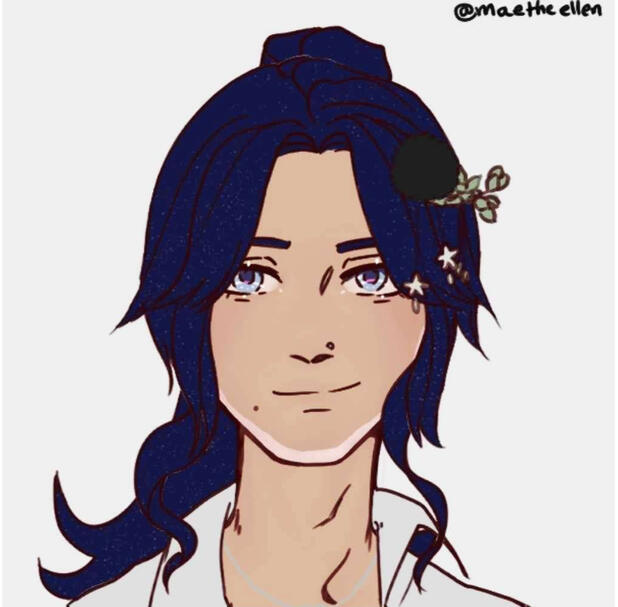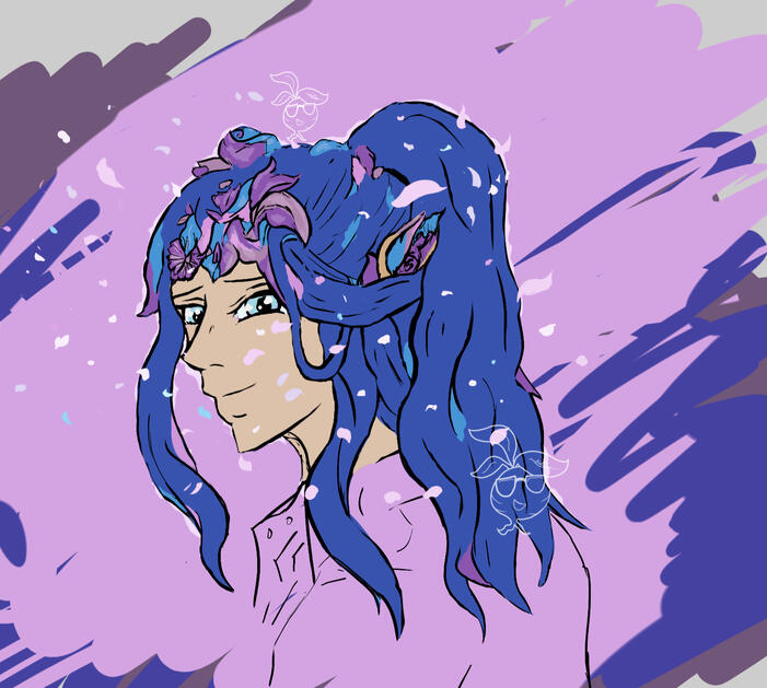 Klous is an aiken, a species said to have been descendents of Midifia, tree goddess. This is reflected in his appearance, where his indigo hair is home to pastel pink and blue petals, and layered ears that resemble a flower. With piercing and analytical winter eyes, a slender tall frame, and light sienna skin, Klous is known to often turn heads. He’s distantly aware of this, but he values his intellect and wisdom far more. Klous dresses semi/ casually formal, often with collared button down shirts and form fitting pants (jeans or otherwise), sometimes with suspenders.